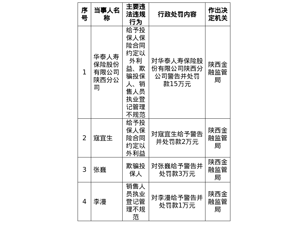 罚单表示,华泰东说念主寿保障股份有限公司陕西分公司的主要犯法违纪事实(案由)为:赐与投保东说念主保障契约商定除外利益;哄骗投保东说念主;销售东说念主员捏业登记处置不要领。